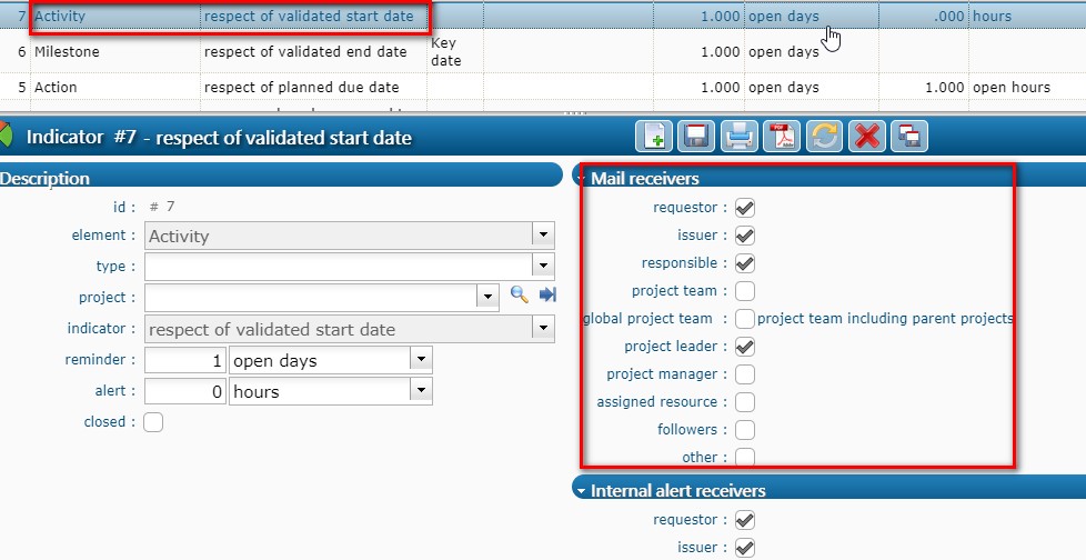 Do you have in the indicator menu an indicator create for the activities which sends an email when the validated start date is exceeded?