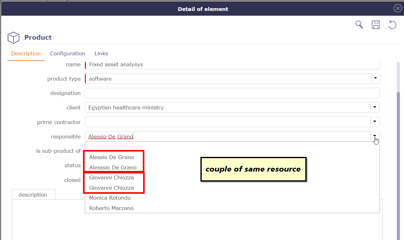 I was trying to define a product and when you ask responsible I see more than one reference for the same resources.