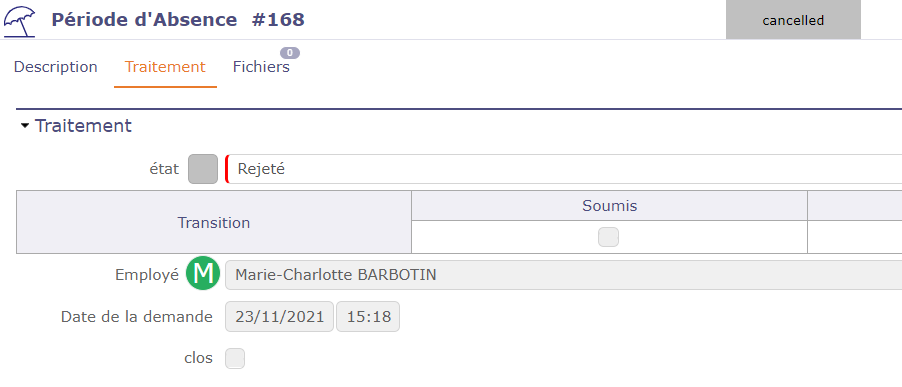 In addition, I have modified the workflow for absences to be able to change the status from "cancelled" to "rejected" and here again I have the following error message: