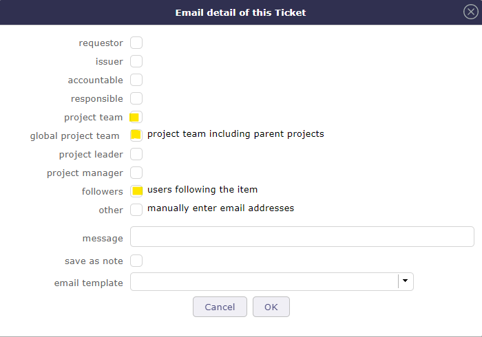 When you send the detail of the item, several choices are offered to you such as the project team or the global project team which will include all the people assigned to the project.