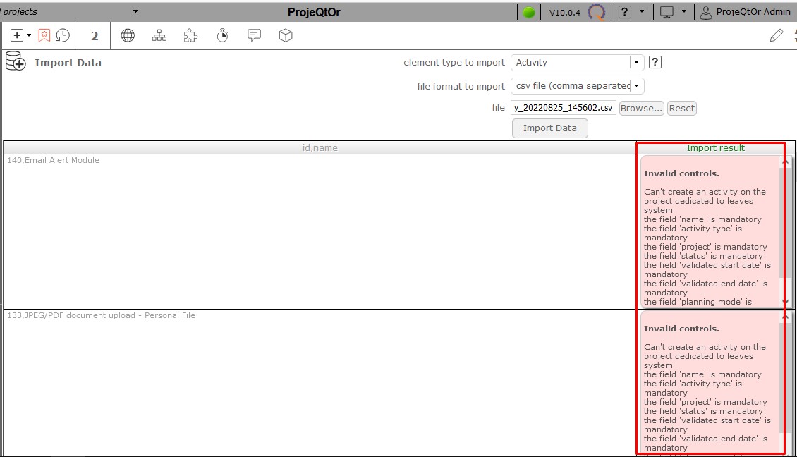 9 - The messages on the right side tell you if the activity has been correctly imported or if a problem has been detected. The messages are very explicit.