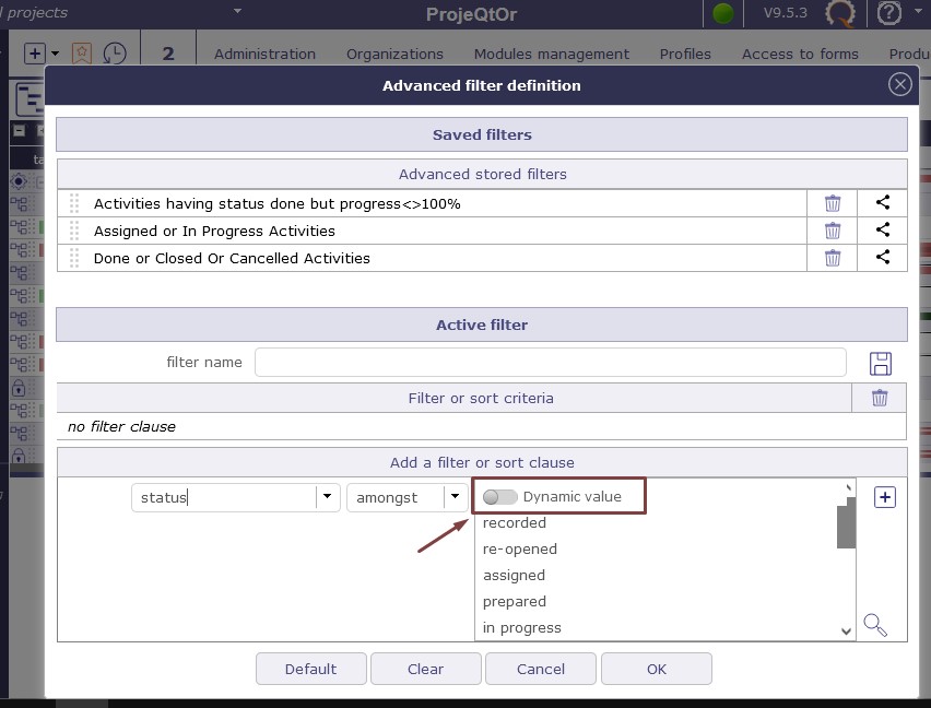 The dynamic value, when it is selected for a saved filter, will offer you a pop-up with all the values present in the list and it is when calling the filter that you will select the value, here the status, you want to display !