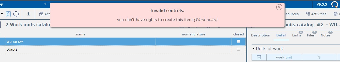 - When trying to add "work units" in the Details tab of a catalog, an error informs the PM that they do not have access rights to create a Work Unit.