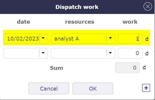 If you use Dispatch work to enter work for another resource on another day, you'll see work on timesheet of this resource, on selected day.