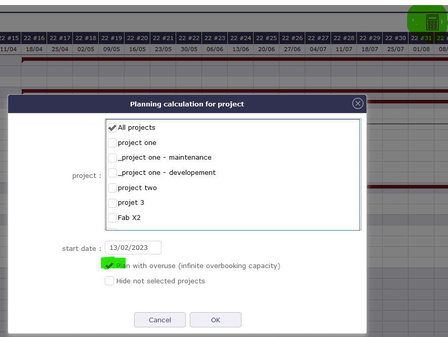 This is what you can find in the online manual about overuse ( manual.projeqtor.org )