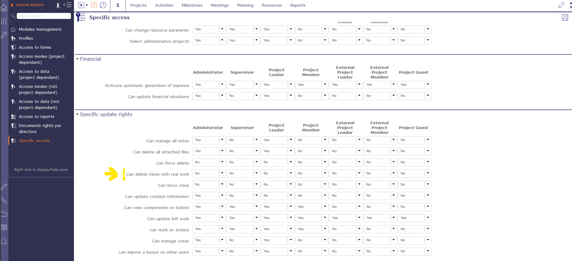 But, in case you really want to delete an item with real work, connected as an Admin, you can manage this on the "Specific Access" screen, according to the Profiles you want to have that right. Take care not to give this right to everyone since it's not recommended.