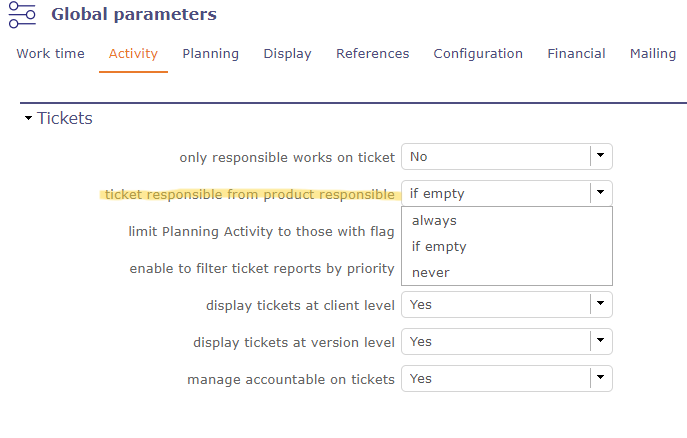 We are having a problem with assigning responsible to tickets. The problem appears when the ticket has a product assigned. If the product has a responsible assigned, then it doesn´t allow us to set the ticket to another responsible. It gets fixed to the responsible of the product. Is it ok to be like that? Or it's a bug?