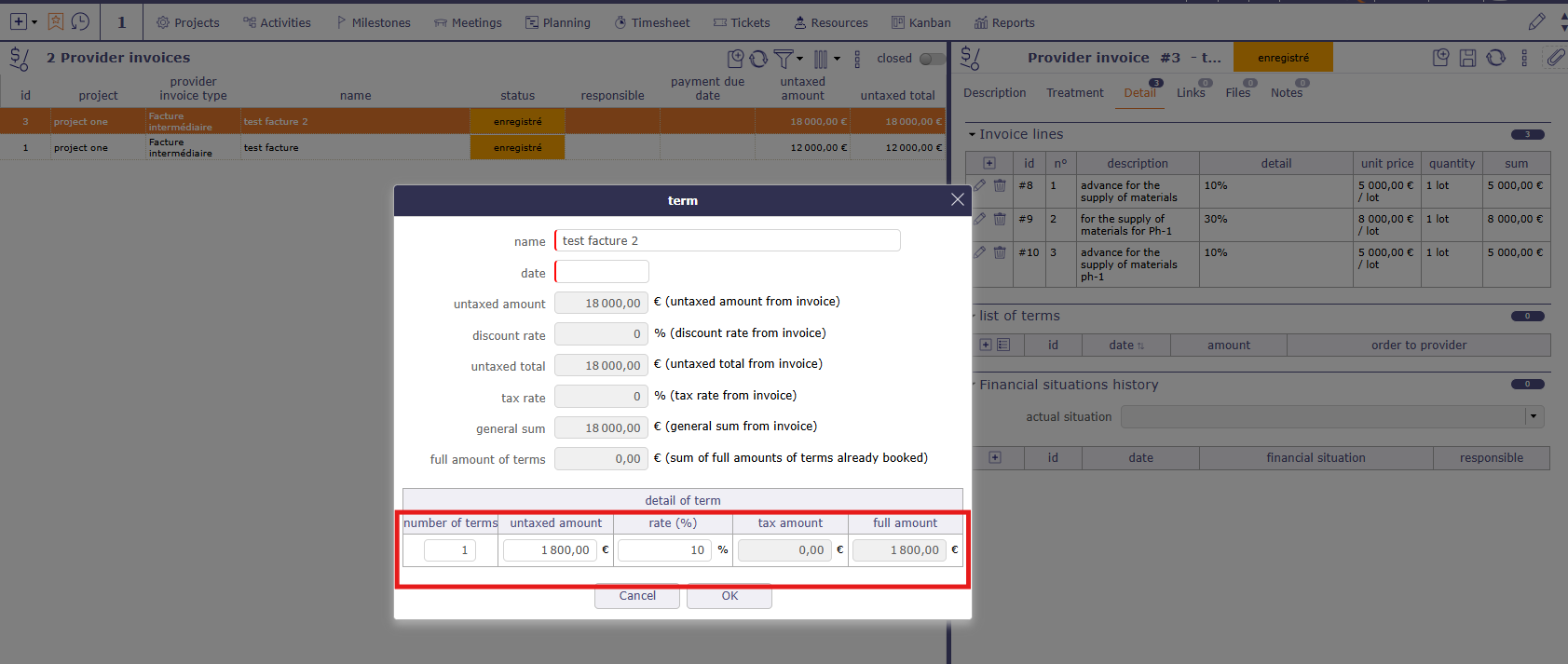 As you suggested I have created provider order and terms. Through terms, orders, invoices, multiple payment schedule can be captured. But when we see the report under COST or FINANCIAL, the line items in the terms are not displayed.