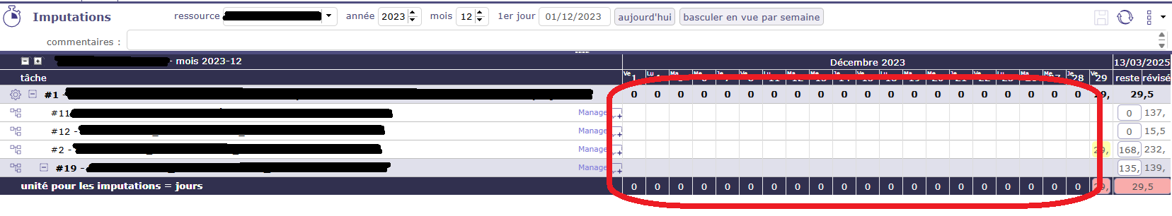 In this case, I'm entering actual hours related to activities for one of my colleagues. However, while everything worked correctly up to now, I'm now unable to enter their hours between two dates. The time entry boxes have disappeared, replaced by a table where the boxes are not fillable.