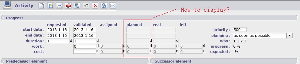 I study the Project'Or RIA Recently. But I don’t know how to Fit and display Planed start date and Planed end date in activity? How to operate? Thank you