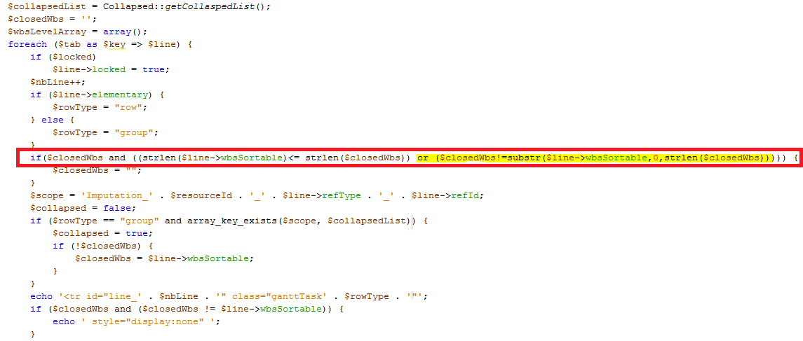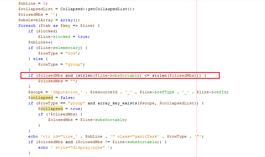 ImputationLine the file, in the drawLine function, for each row of the table containing the getLine function, there is a check and closedwbs wbsSortable of the current line. if two values are different you hide the line, I will wish to understand why this administration and how it works.