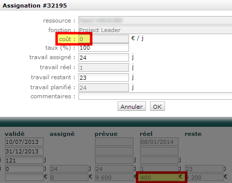 3) Finally, I am also a bit confused about the "start date" for a resource's cost: Since the "start date" for the first cost is greyed out, what date is taken into account ? I'm wondering because some existing activities show non-null real cost, while the corresponding assignment shows a cost of 0 (existing actiivty with real work in the past, and today I added a cost of 400€ to the resource). See screenshot for a better explanation.
