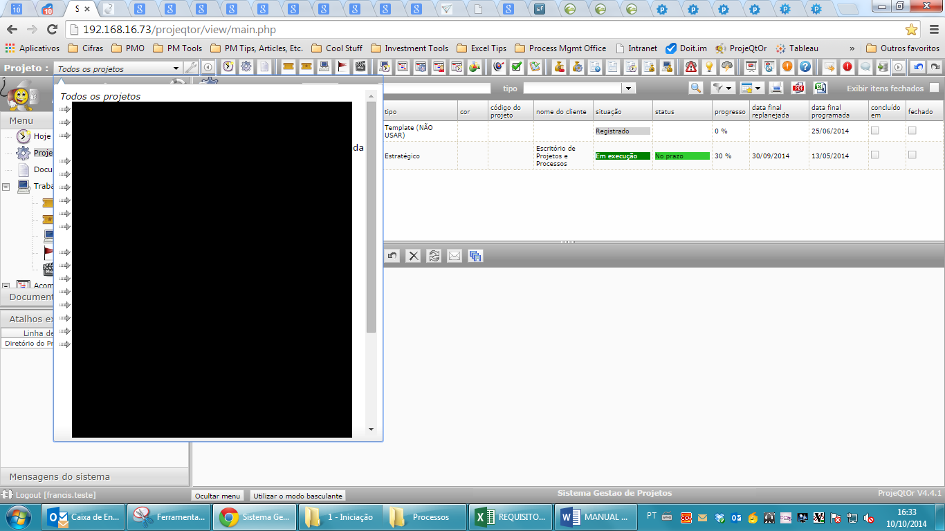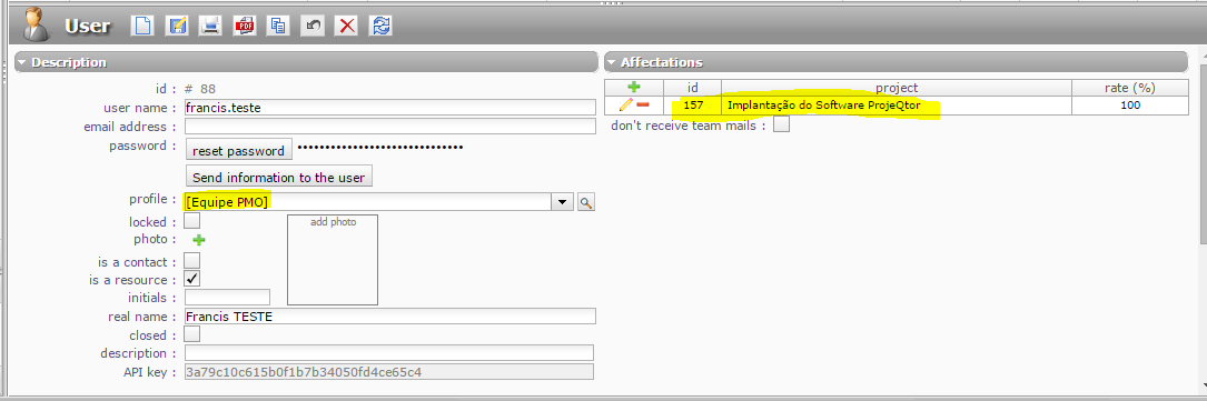 2. The user "francis.teste", with limited visibility, is configured with the profile "Equipe PMO" (PMO Member) - (see picture "User profile.png")
