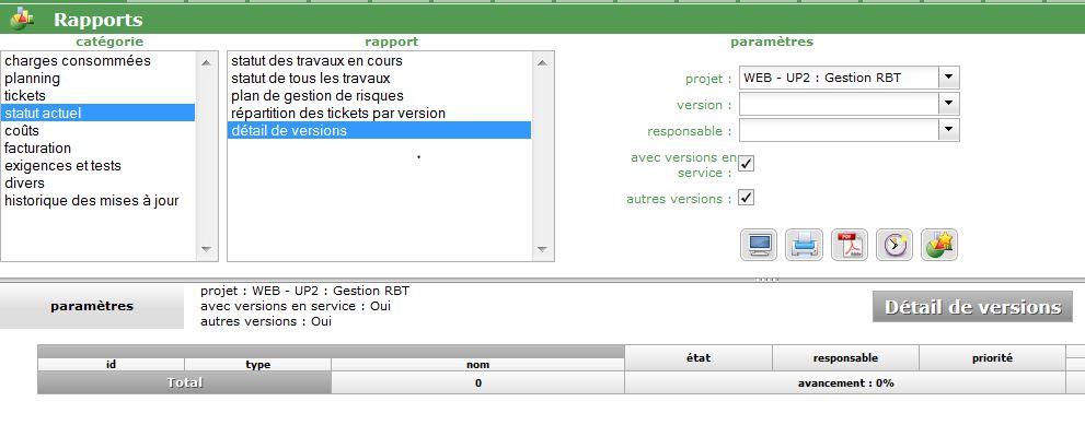 In the report "Current status" - "Detail of versions", when i put a specific project, the result or the submit is empty (no result).