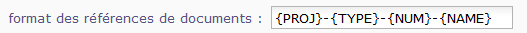 format : can contain {PROJ} for project code, {TYPE} for type code, {NUM} for number as computed for reference, and {NAME} for document name.