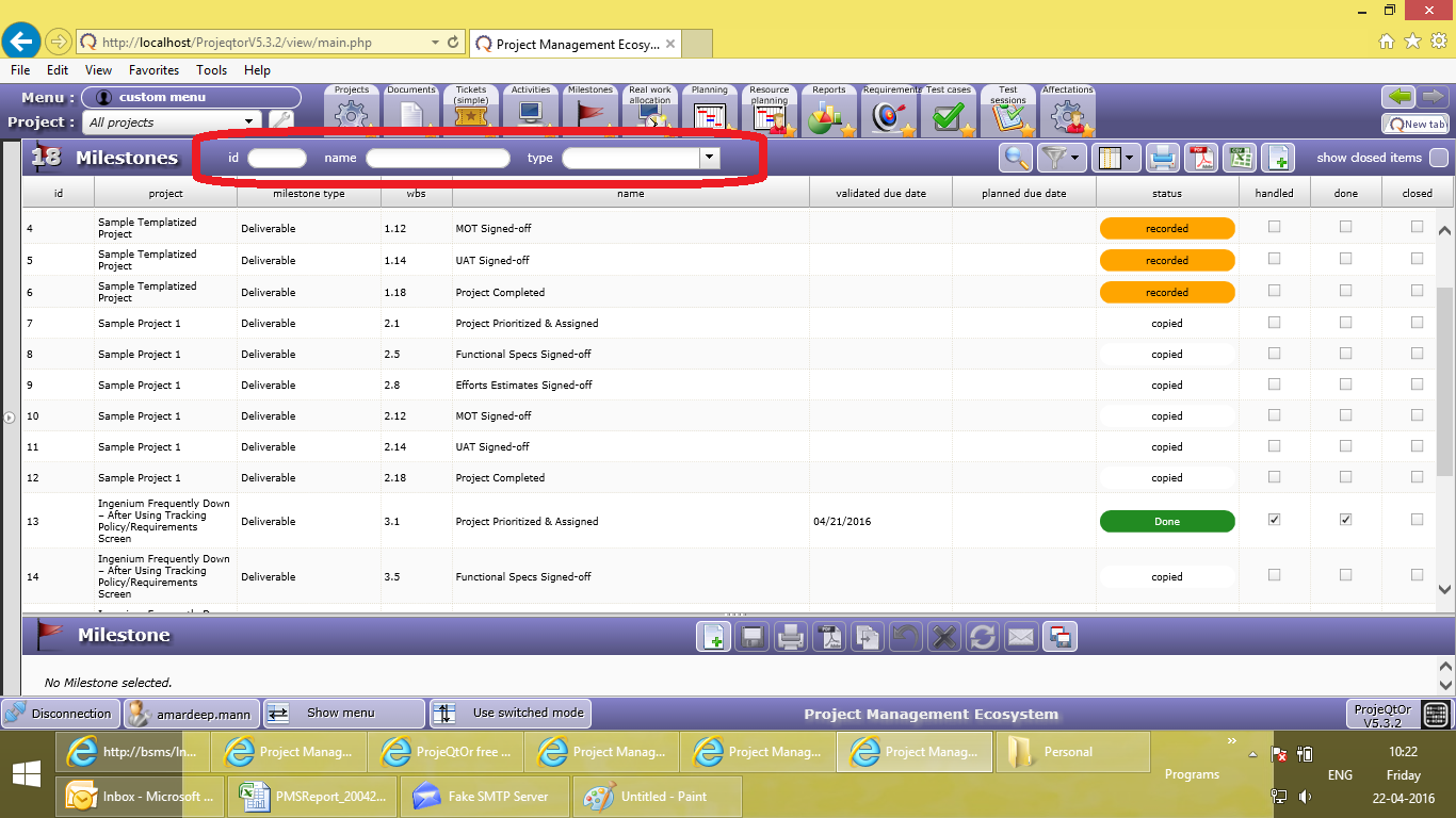 Have a look at the screenshot - where I am showing list of all milestones. This is copied from the Template project. I have generated 2 new projects, as copy of the Template project. The logged-in person is supposed to take some action --- on a milestone of a particular project.