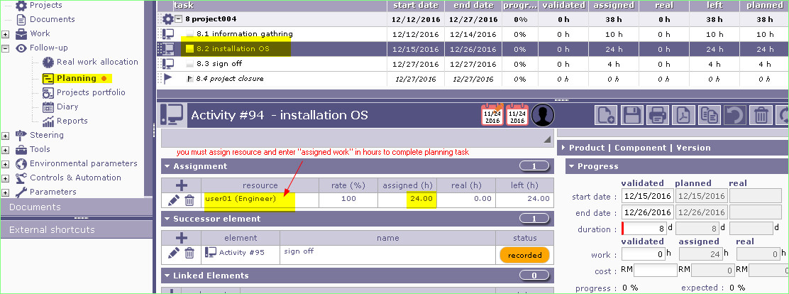 3. assign resource (here i refer to project member (engineer)) --> at activity tab > assignment