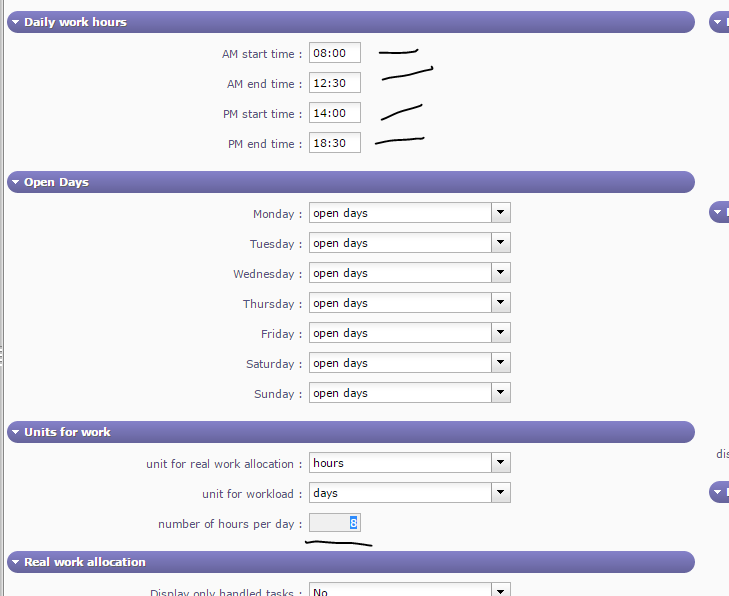 This the way to set possibility to enter real work in hours and display work on activities in days.