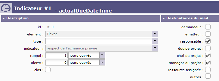 On menu "Contrôle & Automatisme -->Indicateurs", I created a rule that send a mail to reponsible, Manager and Project Manager in case on a "over due date "