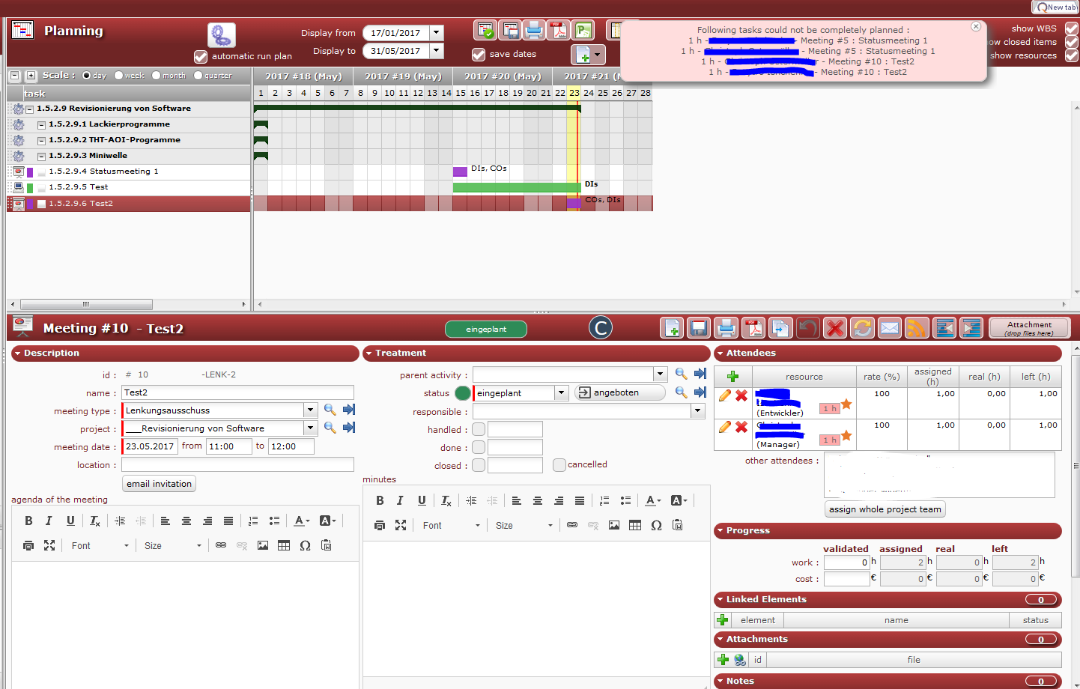 I have a problem if I assign ressources to Meetings. If I run the planning I always get the follwing pop-up Following tasks could not be completely planned