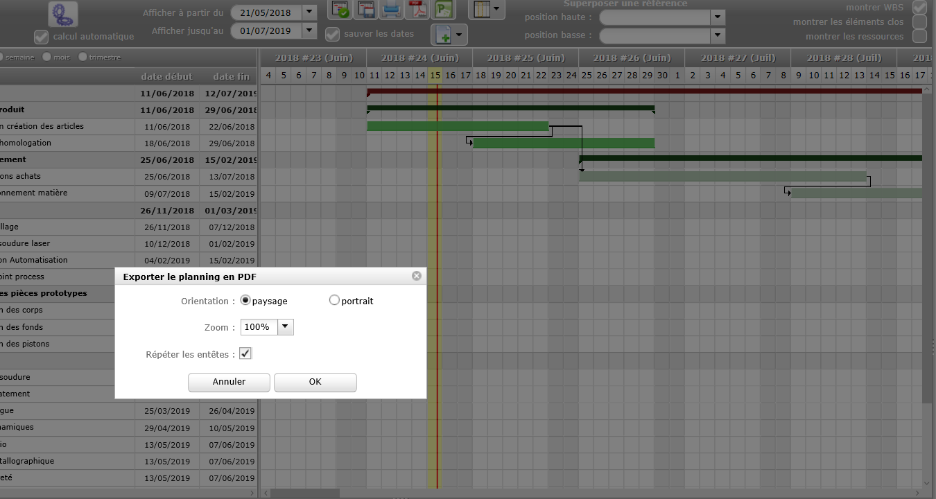 When I tried to get the PDF print of a GANTT planning, the print never comes and the software issue a warning message telling me that a request is already ongoing.