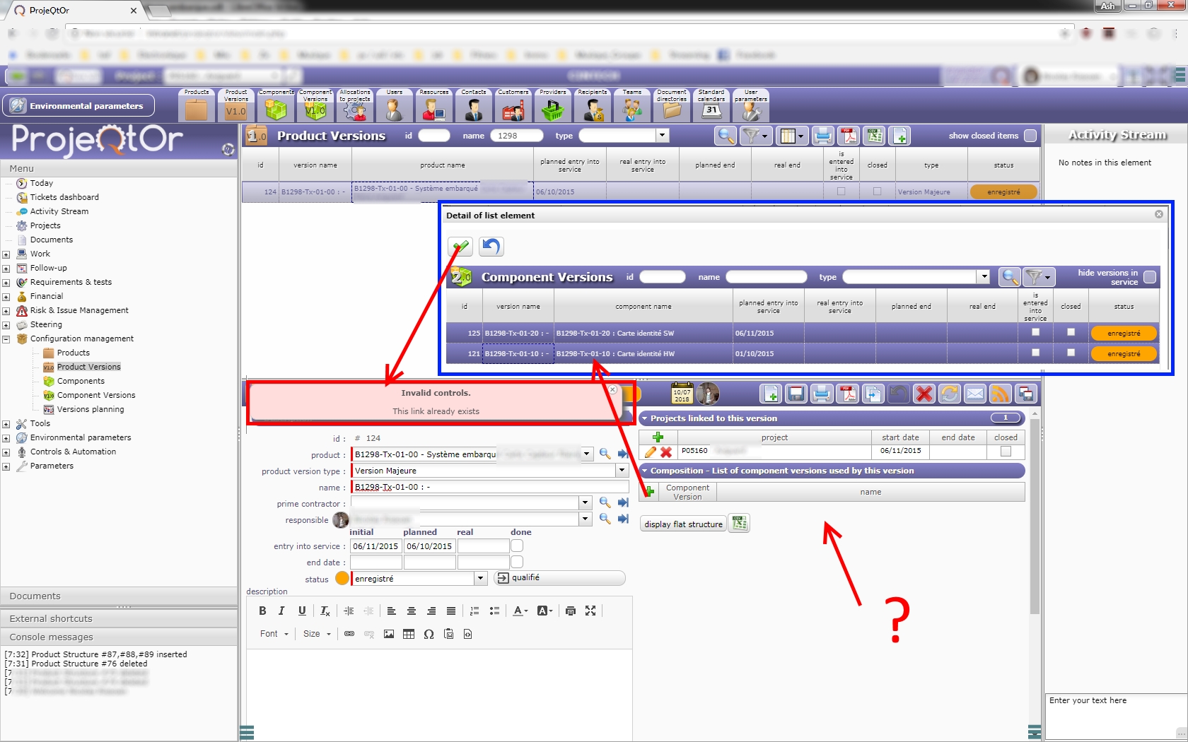 When I click on " add a product version structure" and choice the 2 versions of my Sub components that I want to use for this component Version and then press "valid" . I've got a 'link already exist" message...