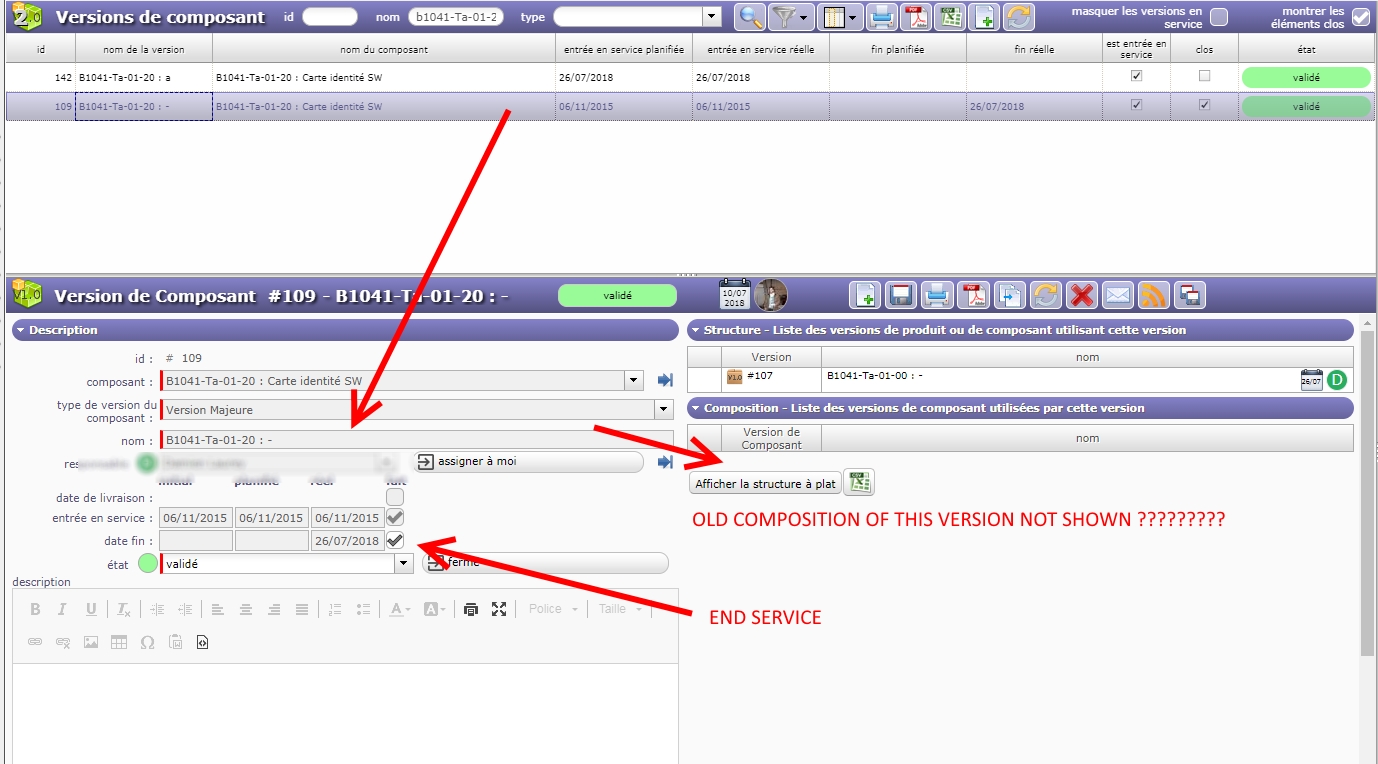 - The second one is my old version of the same component with 'end service' status where the version of subcomponents attached to this version have dissapeared.