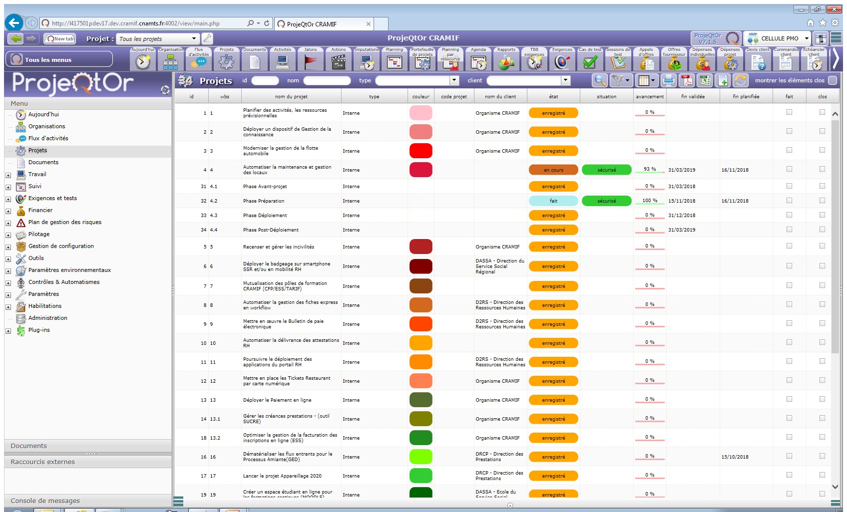 The result is as follows: the progress of the project "Automate maintenance and management of premises" with its status, its situation as well as its sub-projects