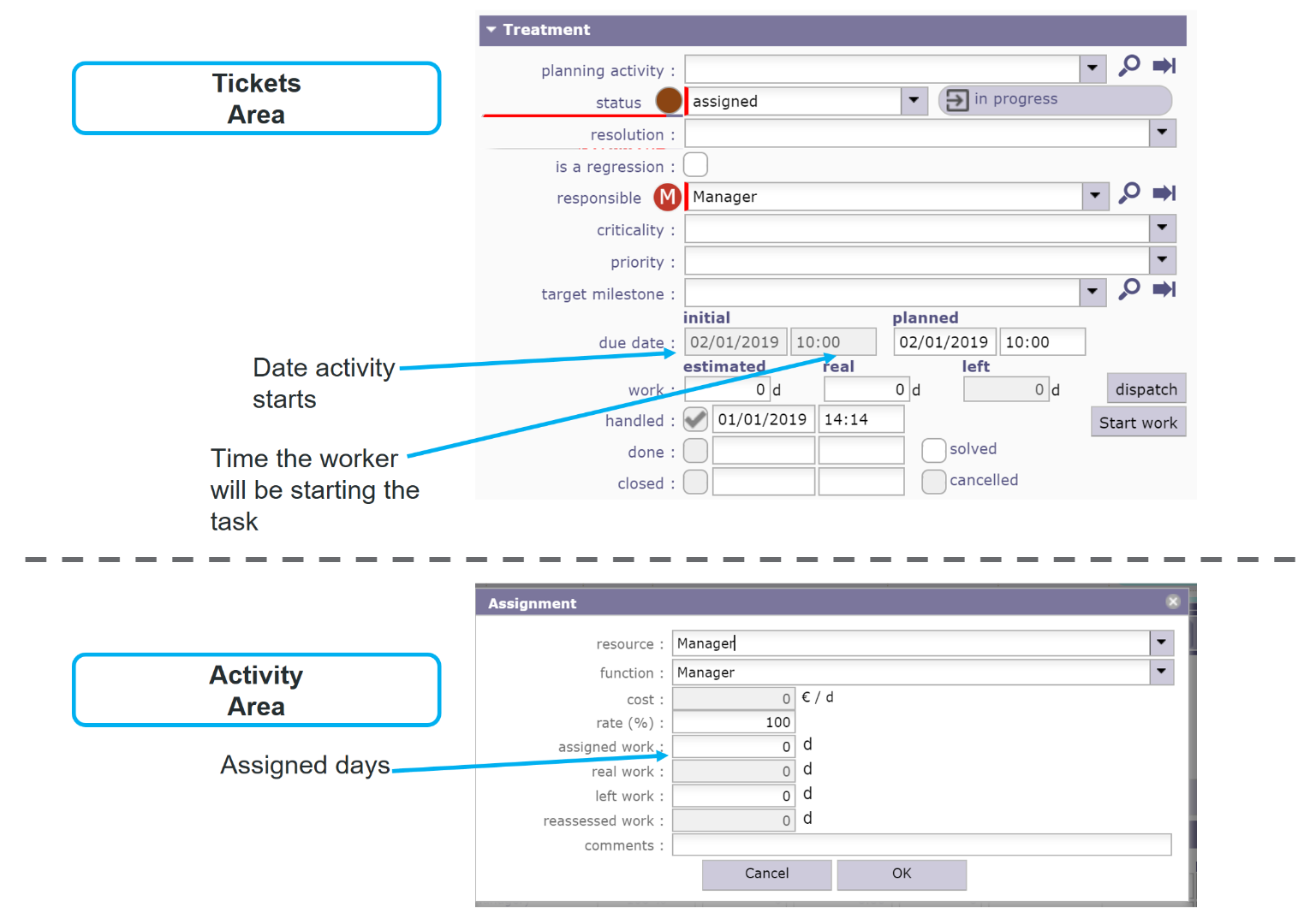 In the tickets area you can assign an initial due date and time from the list with estimated days, now we can make the days as hours which is fine but what we need to do is have this ability in the activities area, in the assignment you can only assign out days and no start time, we can change this to hours but is there any option to show the start time of the activity then all we need to do is plus the amount of hours an activity will take on top of the start time.