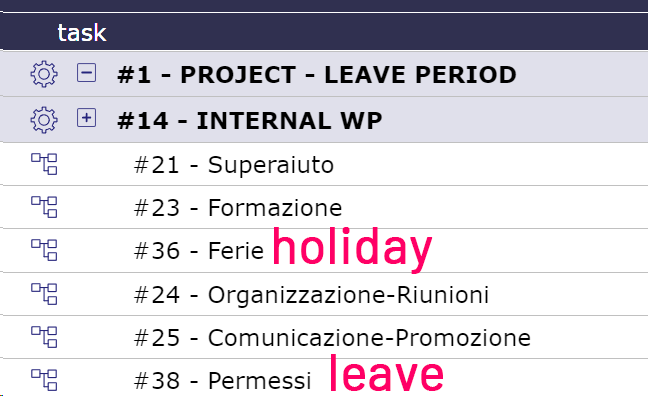 Hello! I'm having some issues with the display of activities and projects on the timesheet. I have the default project #1 - PROJECT - LEAVE PERIOD, to which the "Ferie" (Holidays) and "Permessi" (Leave) types should be associated. However, these activities appear to be associated with another project, and I'm unable to move them correctly. I am attaching a screenshot. Thank you very much for your response.