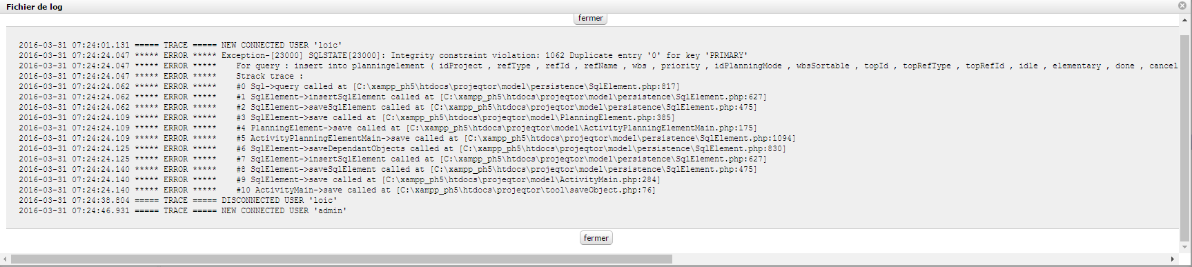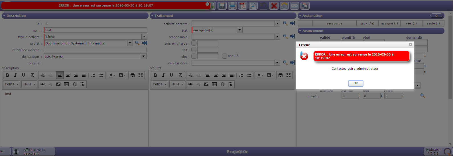 I can not add Activity to my project, if I try, I have an error message saying "please contact an administrator". I checked log file and I see these lines :
