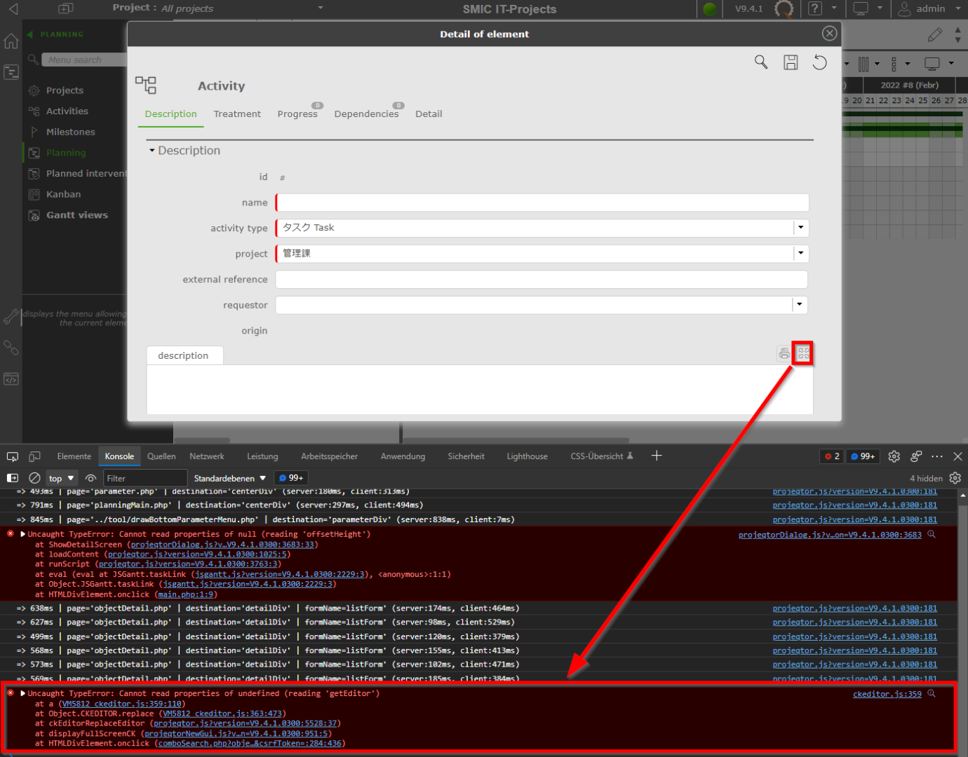 There is a button to change the field with CKeditor into full screen. When I click the icon, I can see some JS errors.