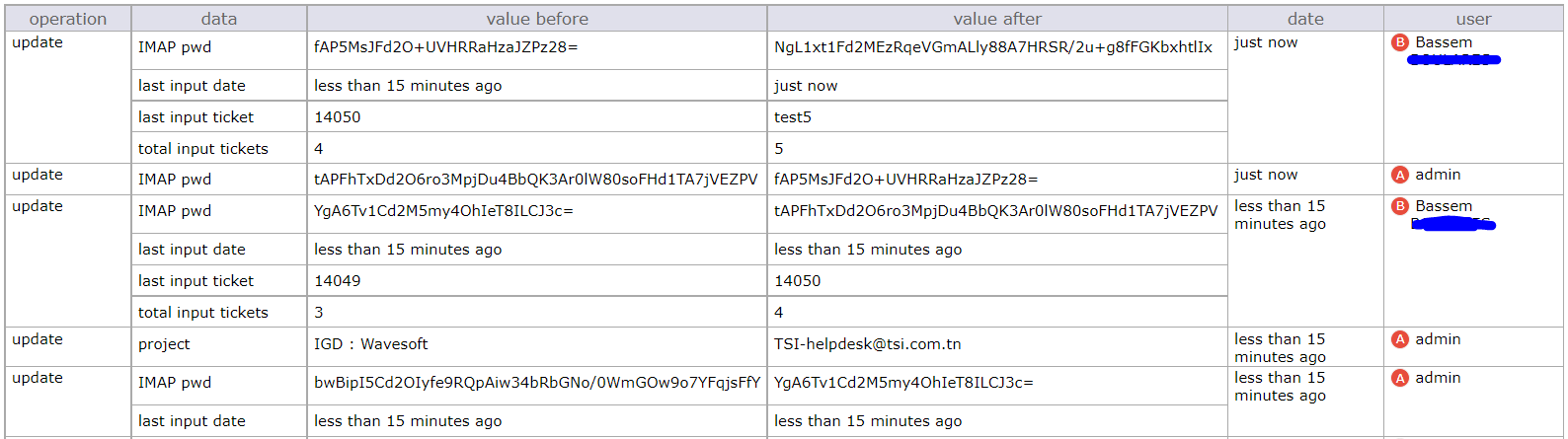 the application changes with each ticket creates the imap password by himself, and registred this change with the user "Bassem"