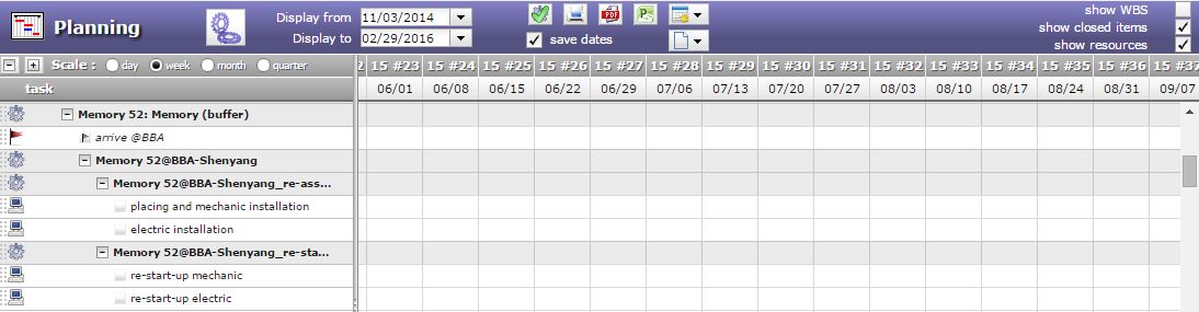If I check the box 'show closed items' in the 'project selector parameters' and after check the same box on the main screen, I can see closed projects on 'project' list and 'activities' list, but not in planning view