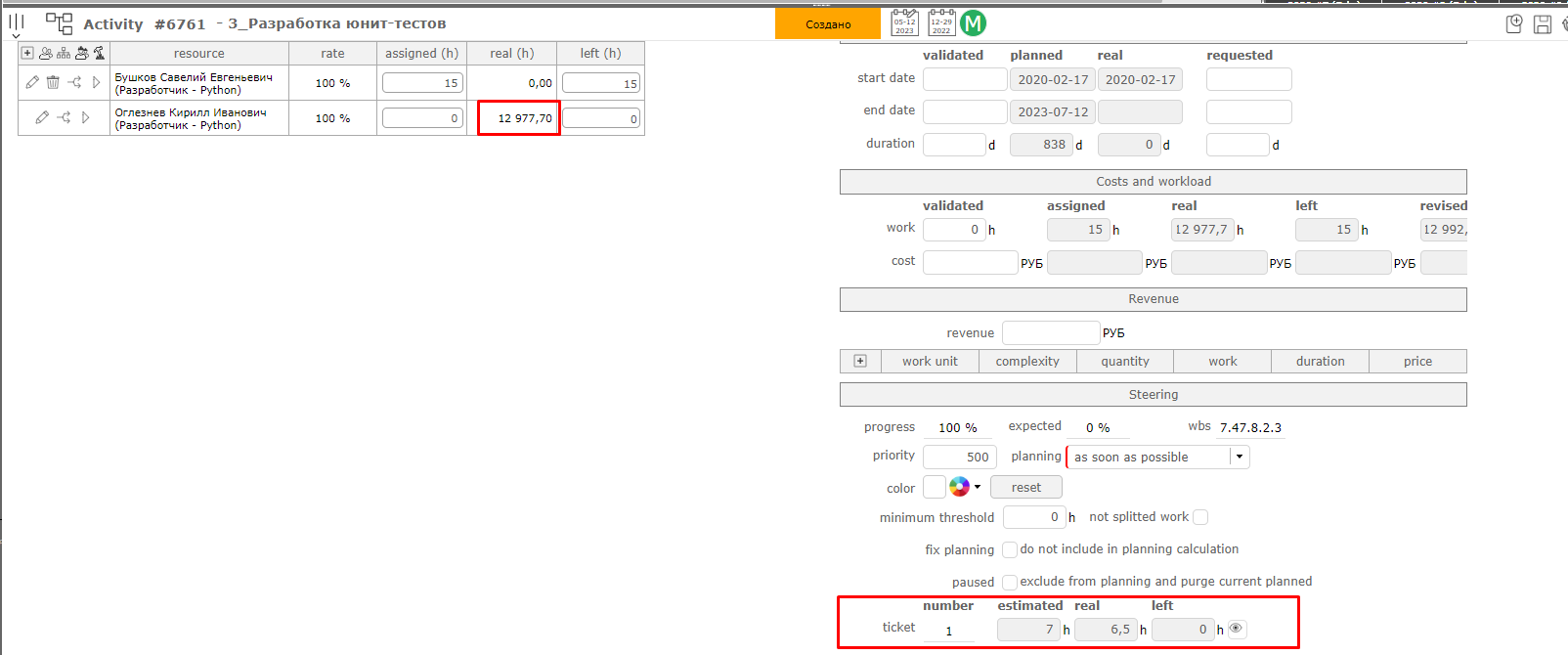 Yes, I do understand that. However, the developer enter the real time in 1 ticket, estimated time was 7 hours, he finished the task for 6,5 hours (screenshot attached). So, the overall real time for the ticket is 6,5 hours. The ticket is linked to the activity. There is only one ticket which is linked to that activity. Our developers dont have rights for the timesheet section to put the real time data to the activity.