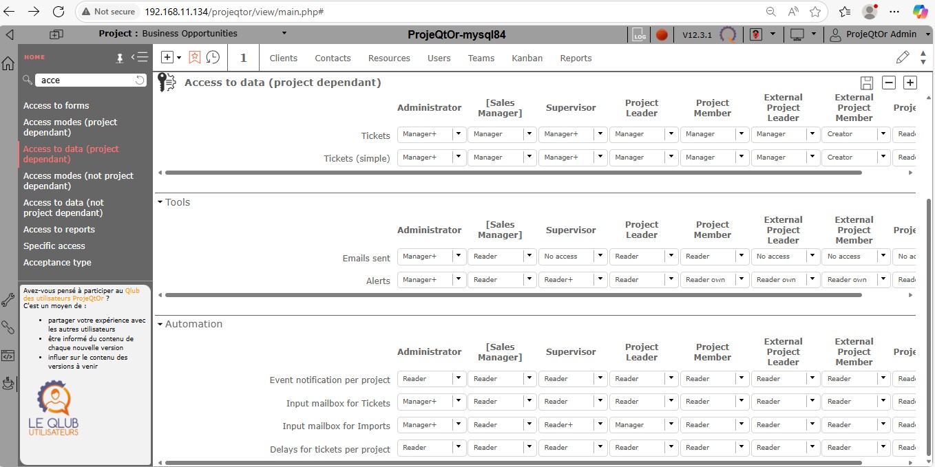 We want to use Projeqtor for project and ticket management and would like your assistance with a specific configuration issue.We have disabled all modules except ticketing, as we intend to use only the ticketing functionality. Two users were created with the "Project Member" profile. We wish to allow clients to self-create tickets without requiring full project access, but when logging in, the system prompts to select a project.Despite searching through the interface, we are unable to find an option to assign these users to any project. There is no visible field or section under user/resource management or project settings to perform this assignment.