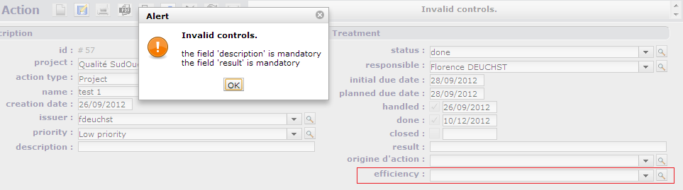 I need to add a mandatory on my field idResultsType in class Action since description or result :
