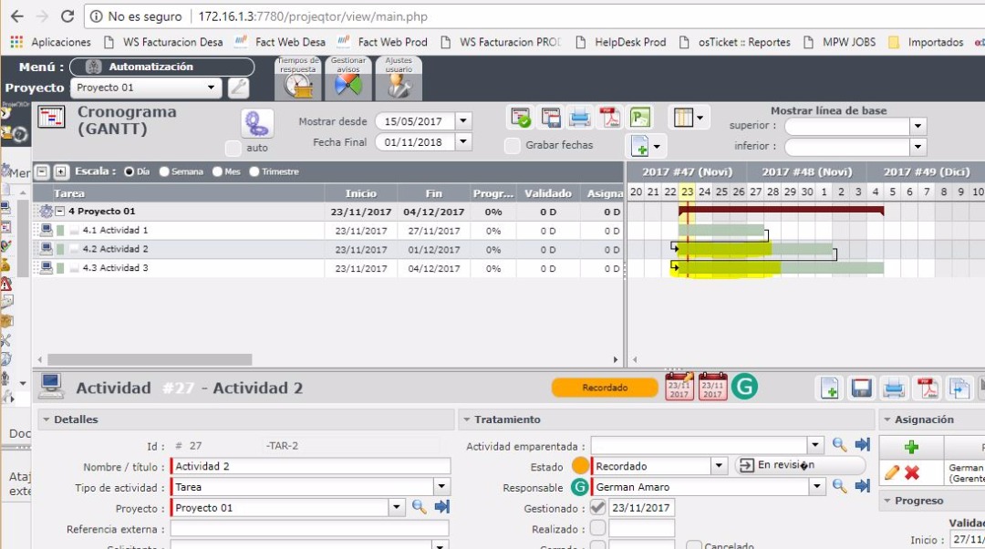 Im stuck on this , its very simple i think. Let say that i have two activities 1 and 2, the second activity must start after the first activity finish. At first both activities have the same start date, then when I add activity 1 as predecesor of activity 2 , what happens is that activity 2 get updated but only end date but the start date remains unchanged. I've performed the same case in PROJEQTOR online demo and it works as espected but local installation does not. In online demo when relate activity 2 has sucesor of activity 1 , the activity 2 has to be moved in gantt view to start after activity 1