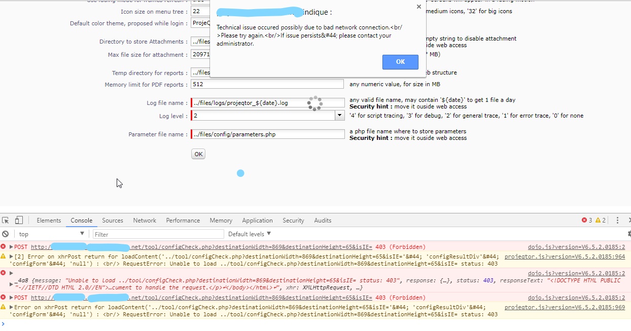 Technical issue occured possibly due to bad network connection.<br/>Please try again.<br/>If issue persists, please contact your administrator.dojo.js?version=V6.5.2.0185:2 POST http://sub.domain.net/tool/configCheck.php?destinationWidth=869&destinationHeight=65&isIE= 403 (Forbidden)Error on xhrPost return for loadContent('../tool/configCheck.php?destinationWidth=869&destinationHeight=65&isIE=', 'configResultDiv', 'configForm', 'null') : <br/> RequestError: Unable to load ../tool/configCheck.php?destinationWidth=869&destinationHeight=65&isIE= status: 403dojo.js?version=V6.5.2.0185:2 _4a8 {message: "Unable to load ../tool/configCheck.php?destinationWidth=869&destinationHeight=65&isIE= status: 403", response: {…}, status: 403, responseText: "<!DOCTYPE HTML PUBLIC "-//IETF//DTD HTML 2.0//EN">…cument to handle the request.</p>↵</body></html>↵", xhr: XMLHttpRequest, …}