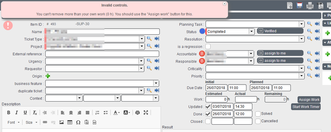 Additional: The same error message appears when i try and assign a time entry (ticket) to a task (activity) although the work hours values haven't changed.