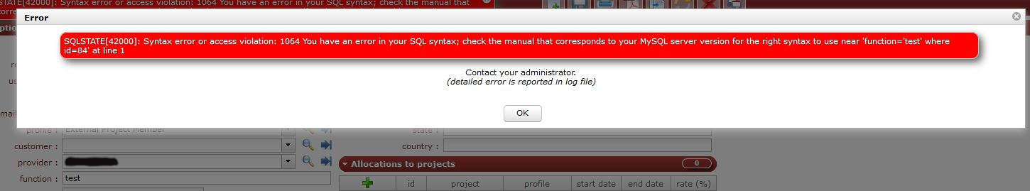When I fill out the field 'Function' (for example in the screen shot 'test') then I get an error message "SQLSTATE[42000]: Syntax error or access violation: 1064 You have an error in your SQL syntax; check the manual that corresponds to your MySQL server version for the right syntax to use near 'function='df' where id=84' at line 1"