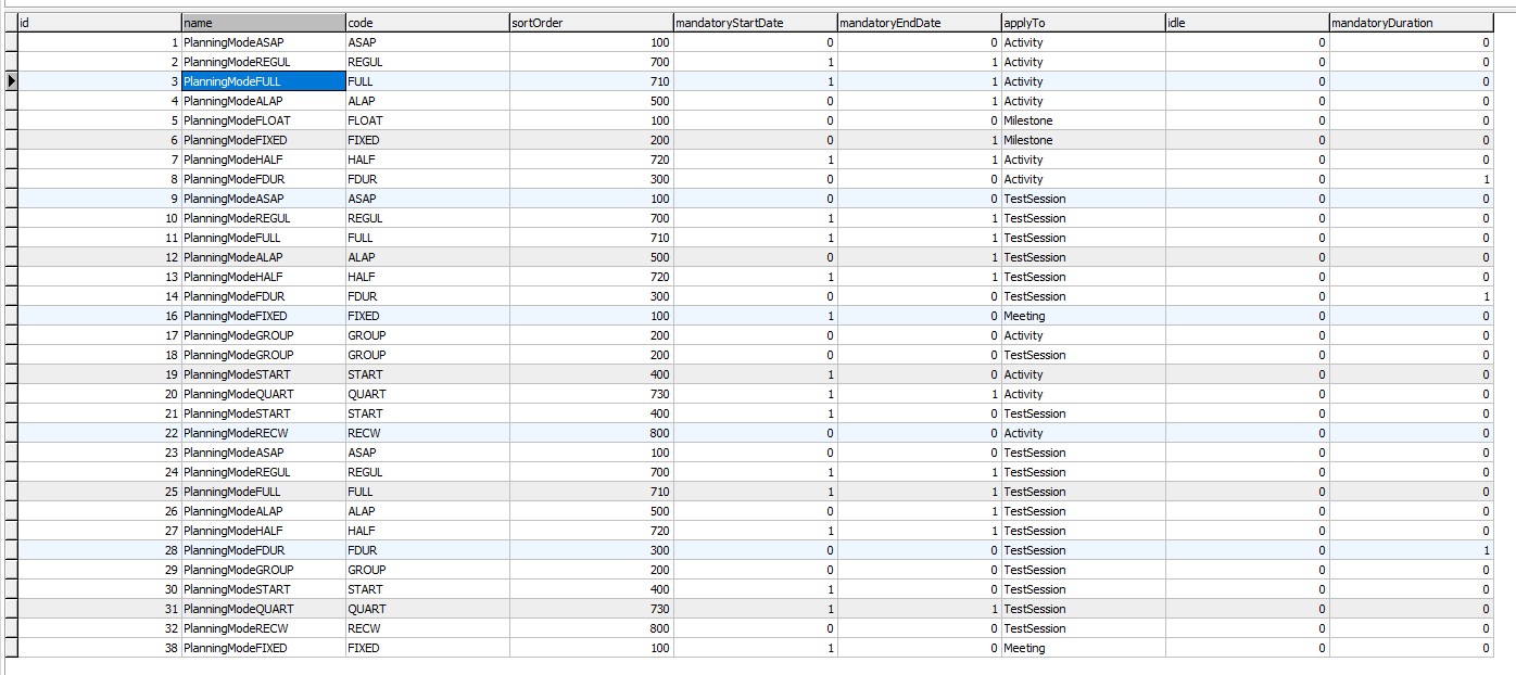 I check table planningelementbaseline and planningelement to show idPlanningMode values used
