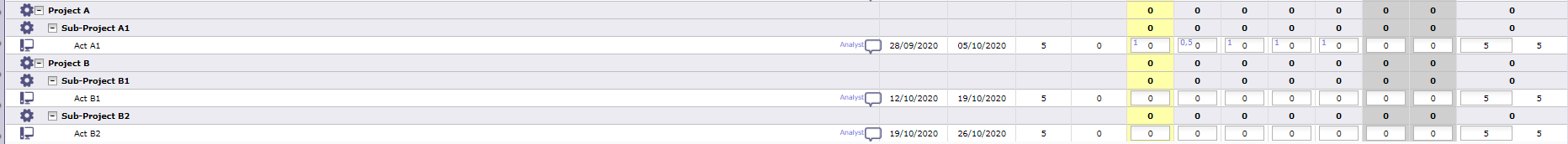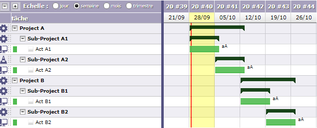 A.2 is a particular subproject : it is a modification campaign and therefore mentionned as «under construction» ... in the timesheet the ressource can access activities of A.1 (normal), cannot access activities of A.2 (normal), cannot access activities of B.1 nor B.2 (definetly not normal).
