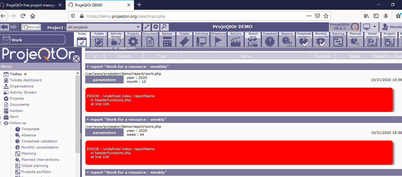 From demo website reports --> Real work --> Work for a resource weekly --> export to pdf --> generated successfully.If we select include this report in today page than on today screen no report is displayed [only error screen]