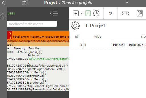 I have this stack trace directly on menu Bar in new design of projeqtor 9.0.2.Fatal error: Maximum execution time of 30 seconds exceeded in C:\UwAmp\www\projeqtor\model\persistence\SqlElement.php on line 3378Call Stack#TimeMemoryFunctionLocation10.0030476976{main}( )...\main.php:0216.674027286288include( 'C:\UwAmp\www\projeqtor\view\menuNewGuiLeft.php' )...\main.php:1316316.681027287056drawLeftMenuListNewGui( )...\menuNewGuiLeft.php:60416.681027287552getNavigationMenuLeft( )...\menuNewGuiLeft.php:512517.056027682704sortMenus( )...\menuNewGuiLeft.php:413628.493627964072sortMenus( )...\menuNewGuiLeft.php:216728.954728032480sortMenus( )...\menuNewGuiLeft.php:216829.971728103808sortMenus( )...\menuNewGuiLeft.php:216929.971728104672SqlElement->getSqlElementsFromCriteria( )...\menuNewGuiLeft.php:1901030.001728138664SqlElement->getDataLength