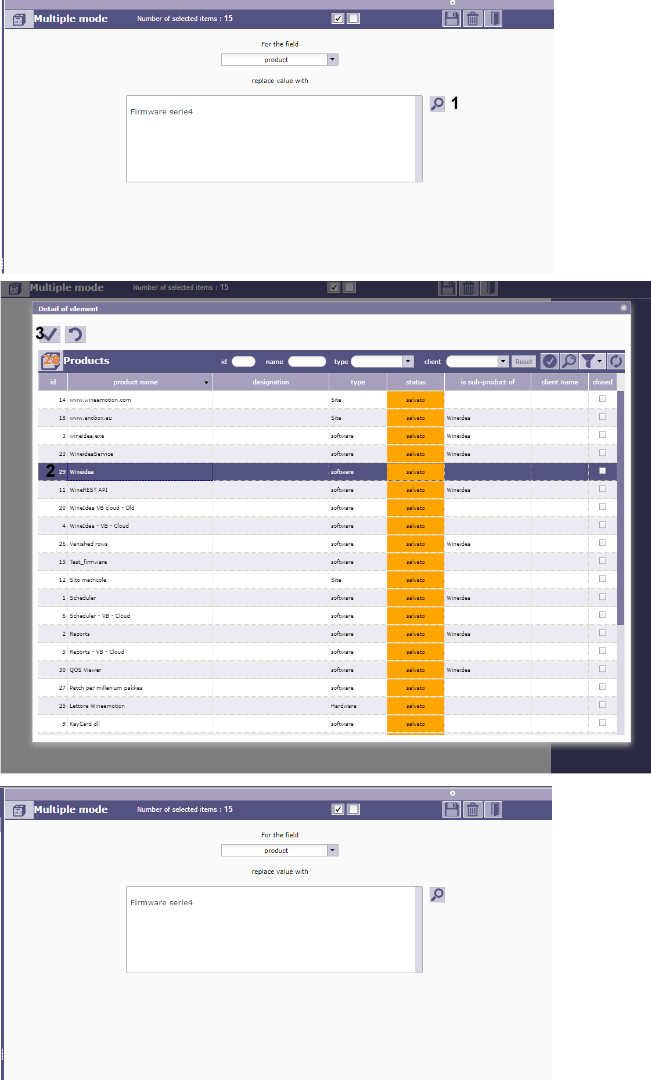 I wanted to change the reference product for many product versions, so I thought about using the multiple update to do this. However, the new product appears to be incorrectly selected. I am attaching an image where you can see the sequence of the actions performed (black numbers) and the result. The same behavior can also be obtained using the new graphical interface.
