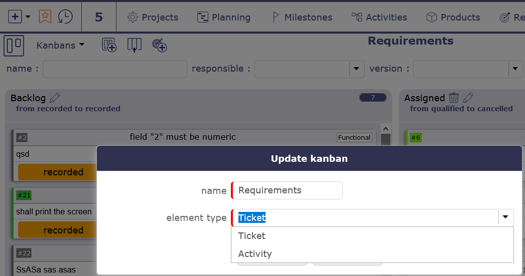 ProjeQtOr free project management software - Kanban: Create actions / change Kanban type to actions - ProjeQtOr