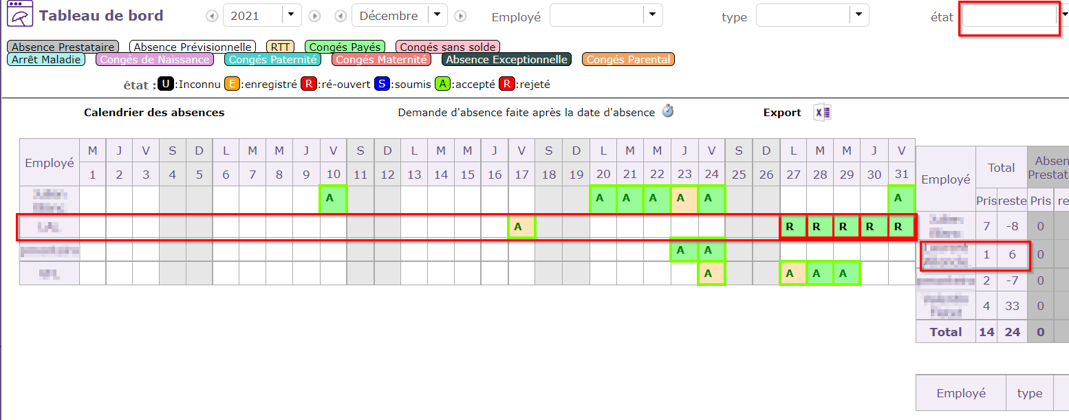 But if I clean the status filter, it is incorrect, if there are leave periods rejected and accepted on the same periods (just the rejected ones are visible and the counter is wrong):