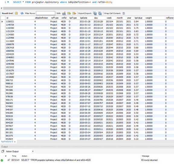 So referring to the data in report/kpiDeliverable.php, we understand that the values of the tables kpiHistory and kpiValue are used.