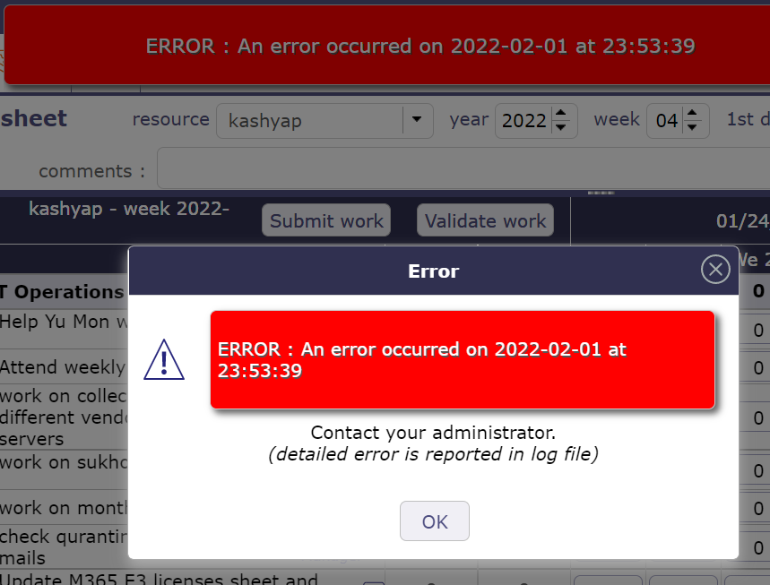 i am facing issue when i enter time  for each task in timesheet section and when click on save . Kindly find the error screenshot in attachement.